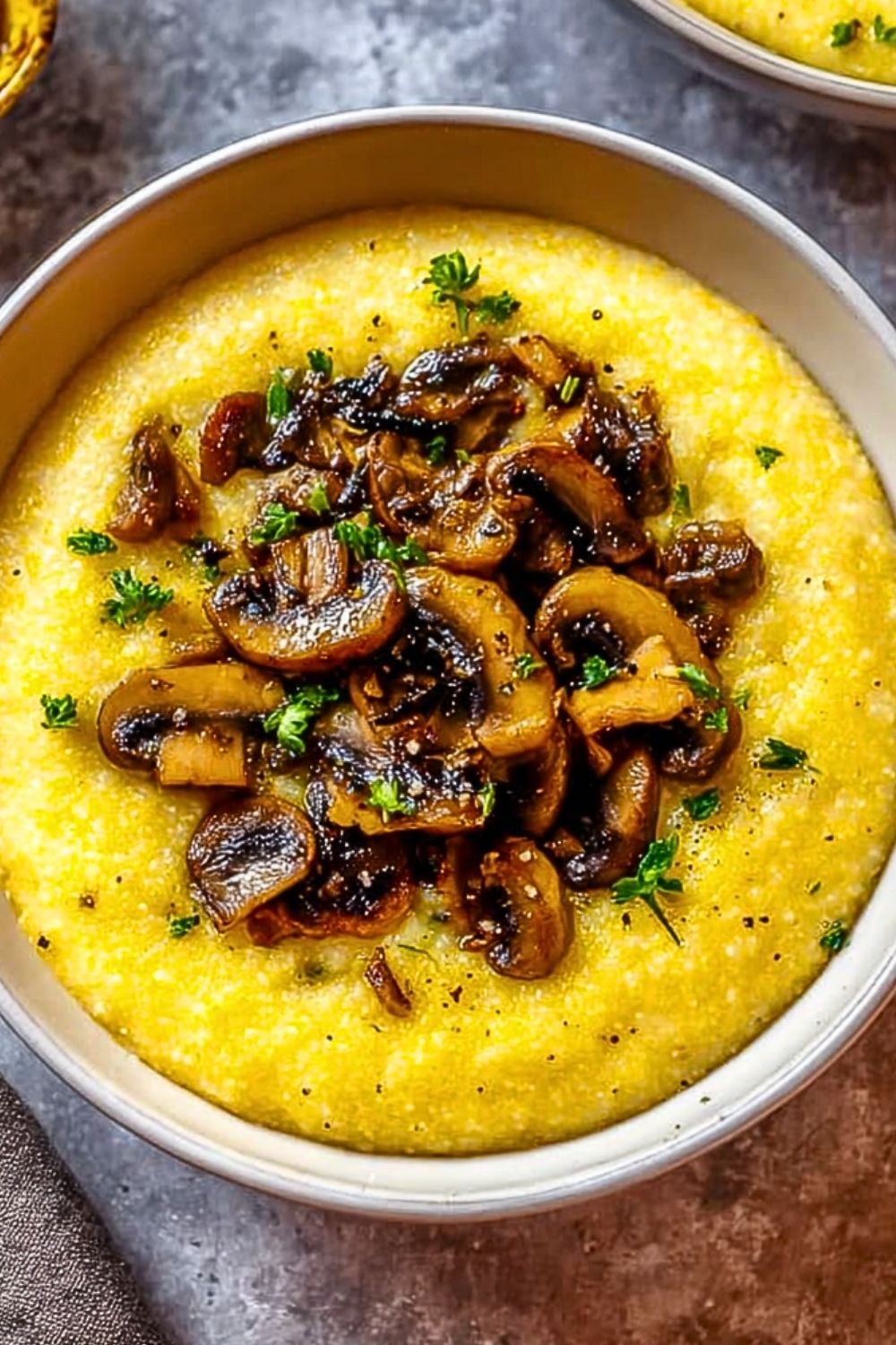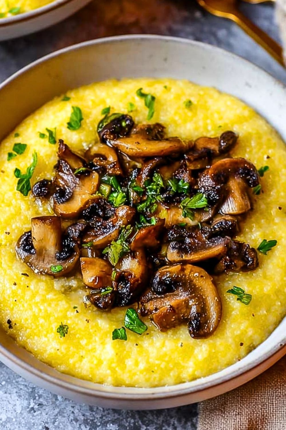 8. Spoon polenta into bowls, top with mushrooms, and garnish with more parsley.