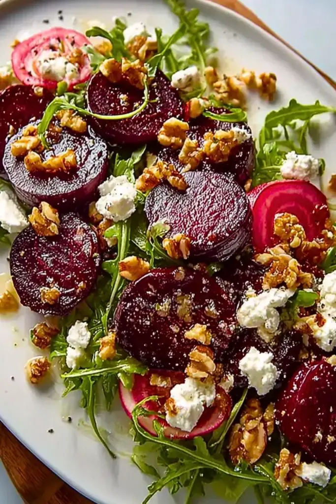Looking for a colorful, nutrient-rich salad that’s bursting with flavor and texture? This Roasted Beet and Arugula Salad is the perfect choice for a quick lunch, elegant starter, or a healthy dinner idea. Sweet roasted beets blend perfectly with peppery arugula, creamy goat cheese, and crunchy toasted walnuts—all topped with a tangy balsamic vinaigrette. Whether you’re in search of an easy recipe for meal prep or new food ideas for gatherings, this dish is sure to impress with its balanced flavors and stunning presentation.