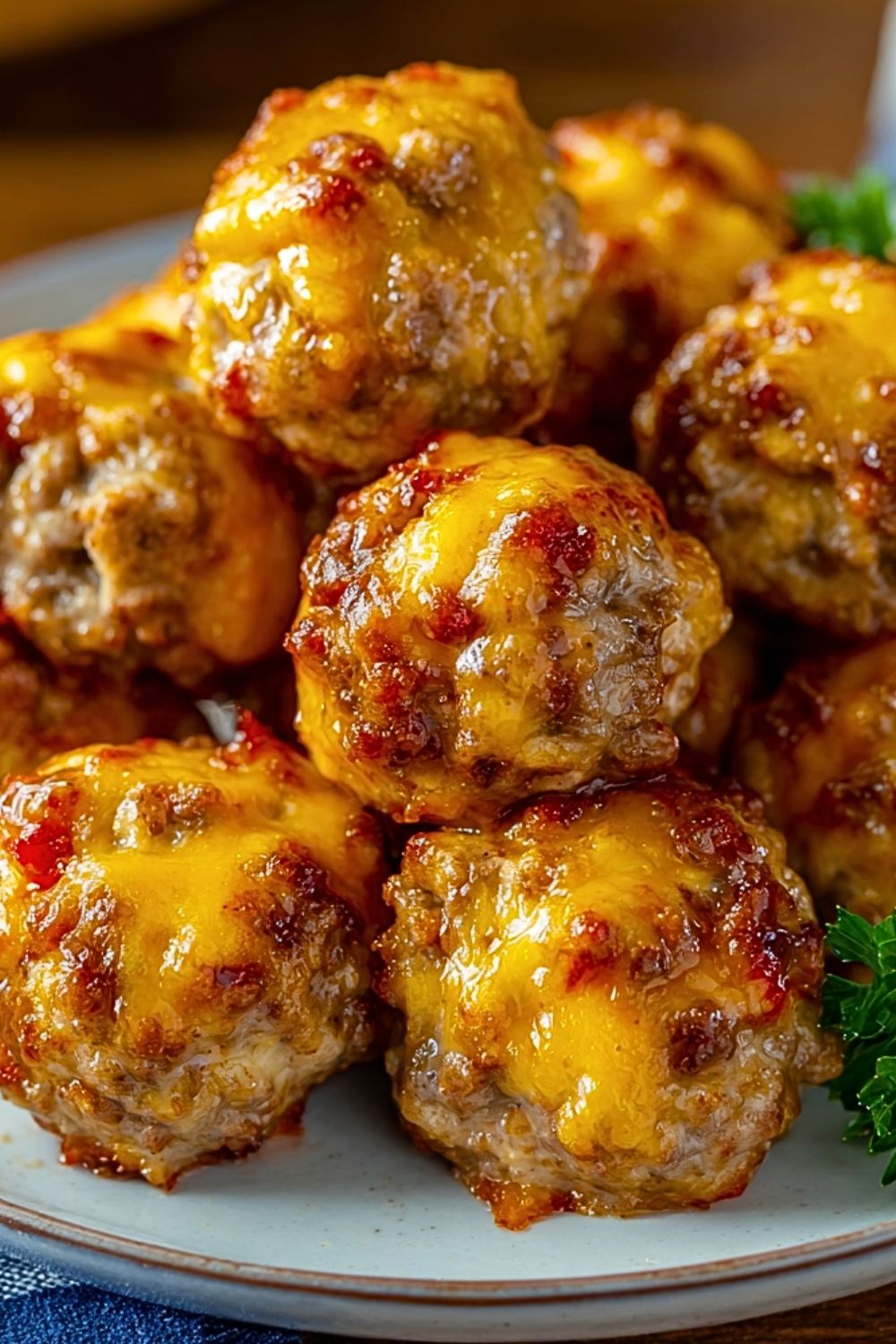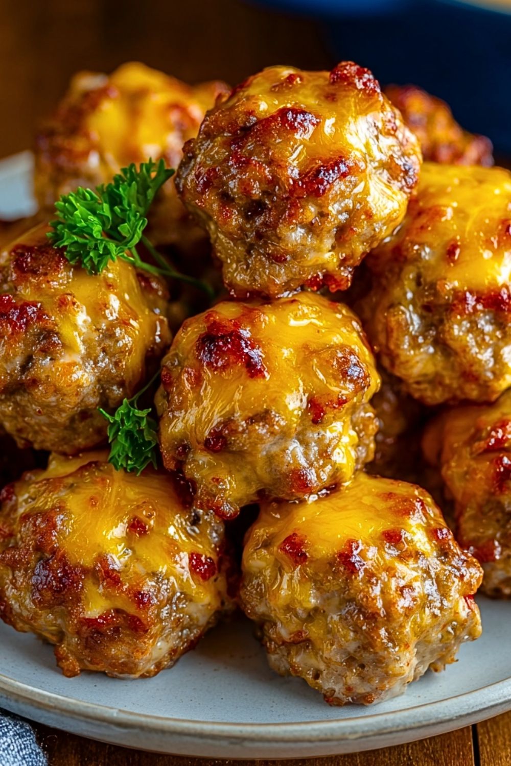 Let the sausage balls cool for 5 minutes before transferring to a serving plate. Garnish with chopped parsley if desired. Serve them warm as an appetizer, snack, or breakfast item.