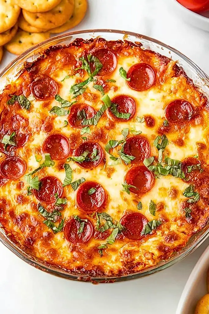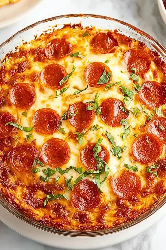 Layers of cream cheese, marinara, melty mozzarella, and crispy mini pepperonis come together in a hot, oven-baked dish that’s practically begging to be scooped up with warm bread, crackers, or fresh veggies. Whether you’re feeding a crowd or treating yourself, this pizza dip is always a win.