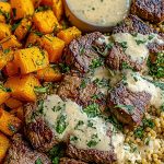 This Savory Butternut Squash & Garlic Herb Steak Bowl is the perfect answer to your search for a hearty, easy dinner or a comforting yet healthy meal. Juicy seared steak bites are coated in a creamy garlic herb sauce and paired with caramelized roasted butternut squash, all served over a fluffy grain base like rice or quinoa. It’s everything you want in a balanced meal—protein-packed, vegetable-rich, and totally satisfying. Whether you’re meal prepping or looking for fresh dinner ideas, this easy recipe delivers delicious, wholesome flavor in every bite.