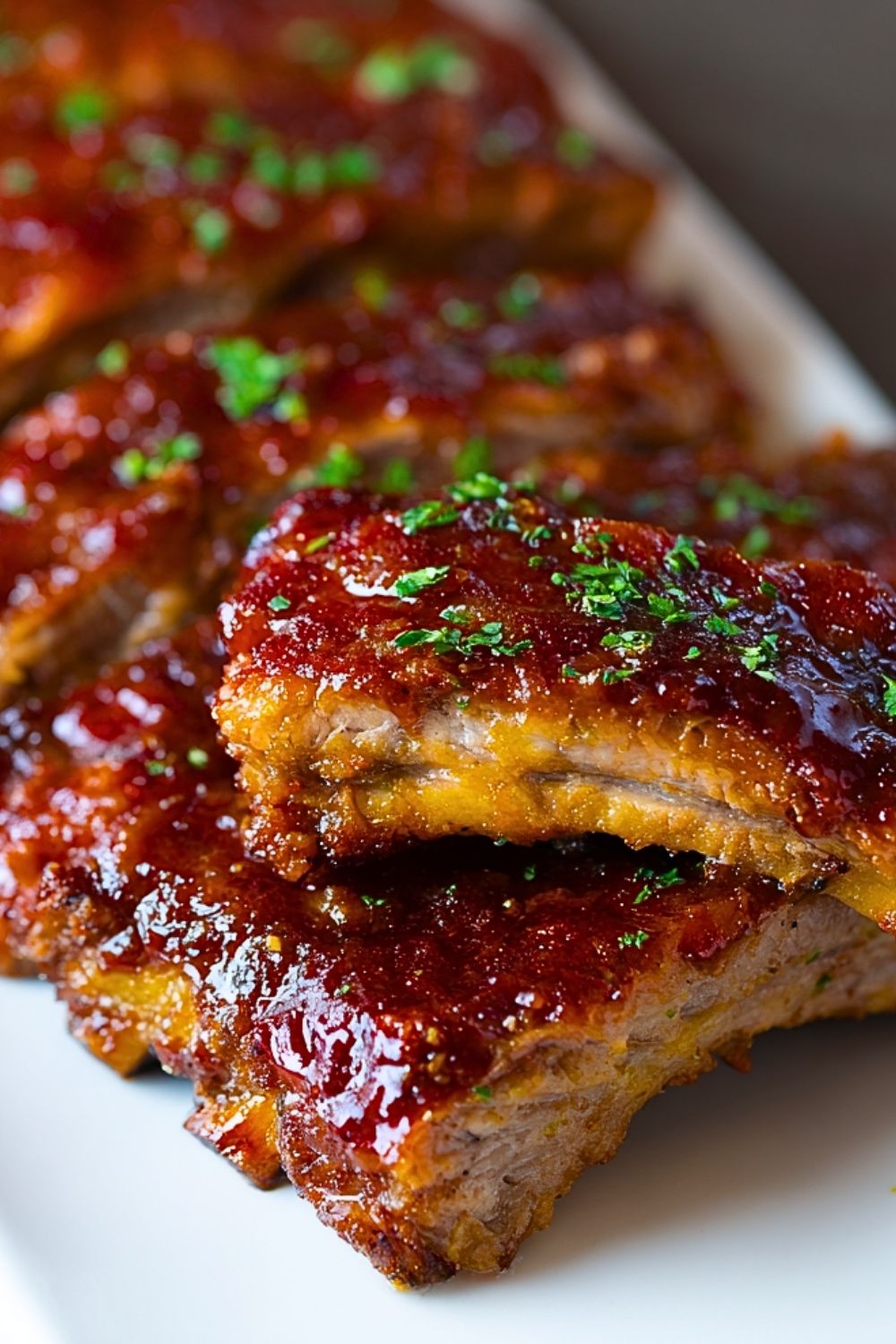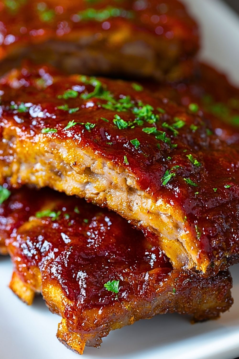 Let the ribs rest for a few minutes before slicing. Garnish with chopped parsley for a fresh pop of color and serve with extra BBQ sauce on the side.