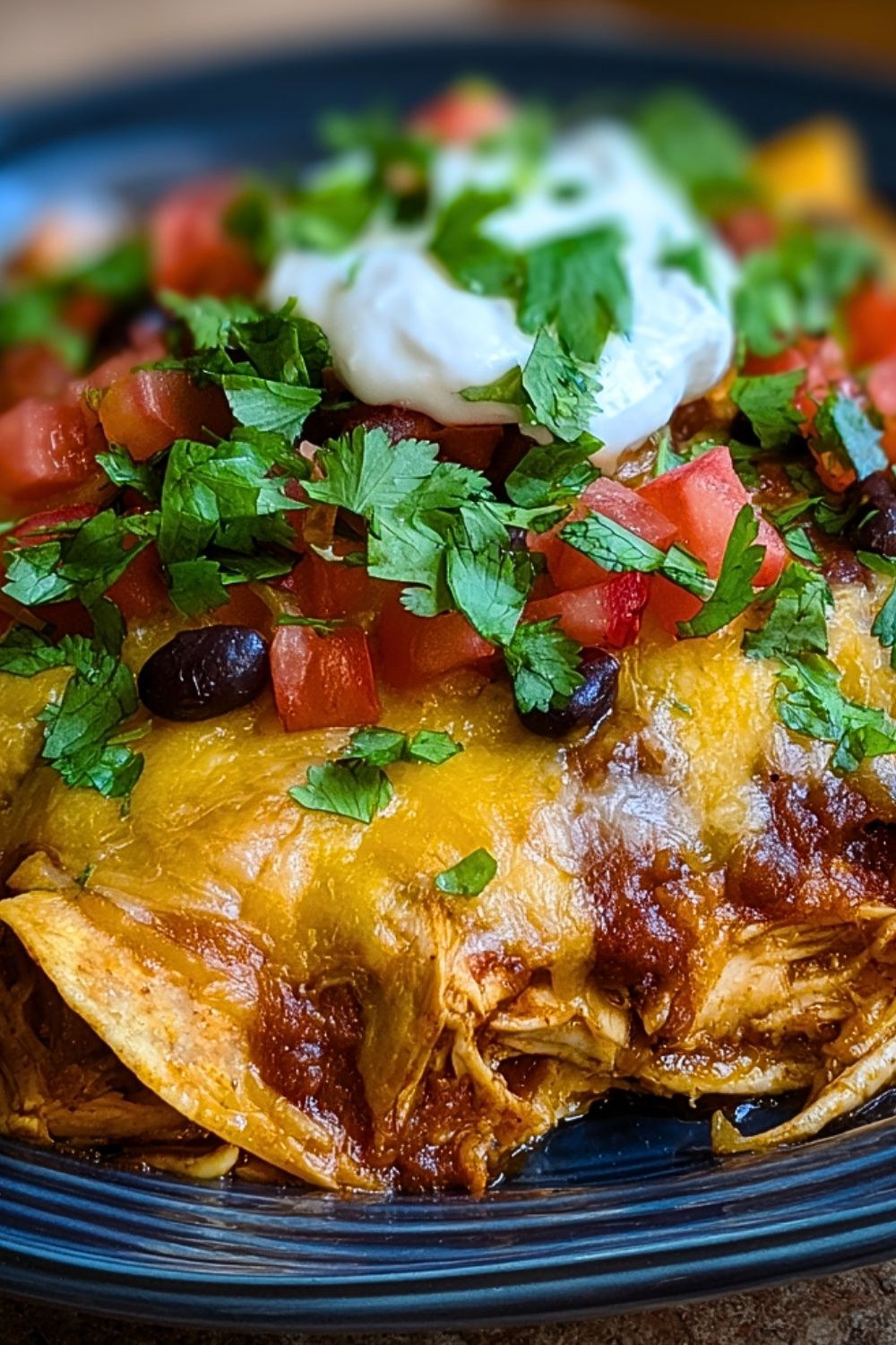 Repeat the layering process: chicken mixture (if reserved), tortillas, sauce, and cheese. Aim for 2–3 layers depending on the size of your slow cooker. Finish with a thick layer of cheese on top for a golden, melty finish.