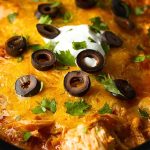 Once cooking is complete, sprinkle sliced black olives and chopped cilantro over the top. Let it rest for about 10 minutes before serving to allow the casserole to set.