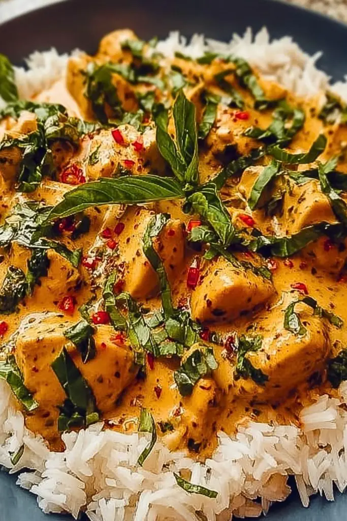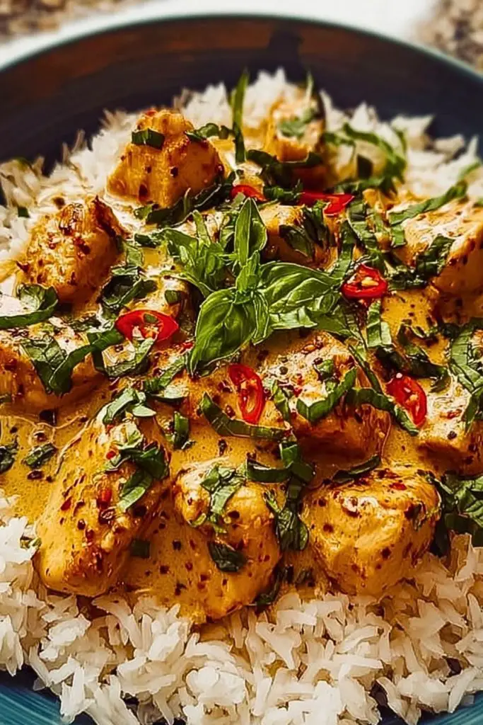 Spoon generous portions of the creamy coconut basil chicken over warm rice. Garnish with the remaining basil and a pinch of extra chili flakes if desired.