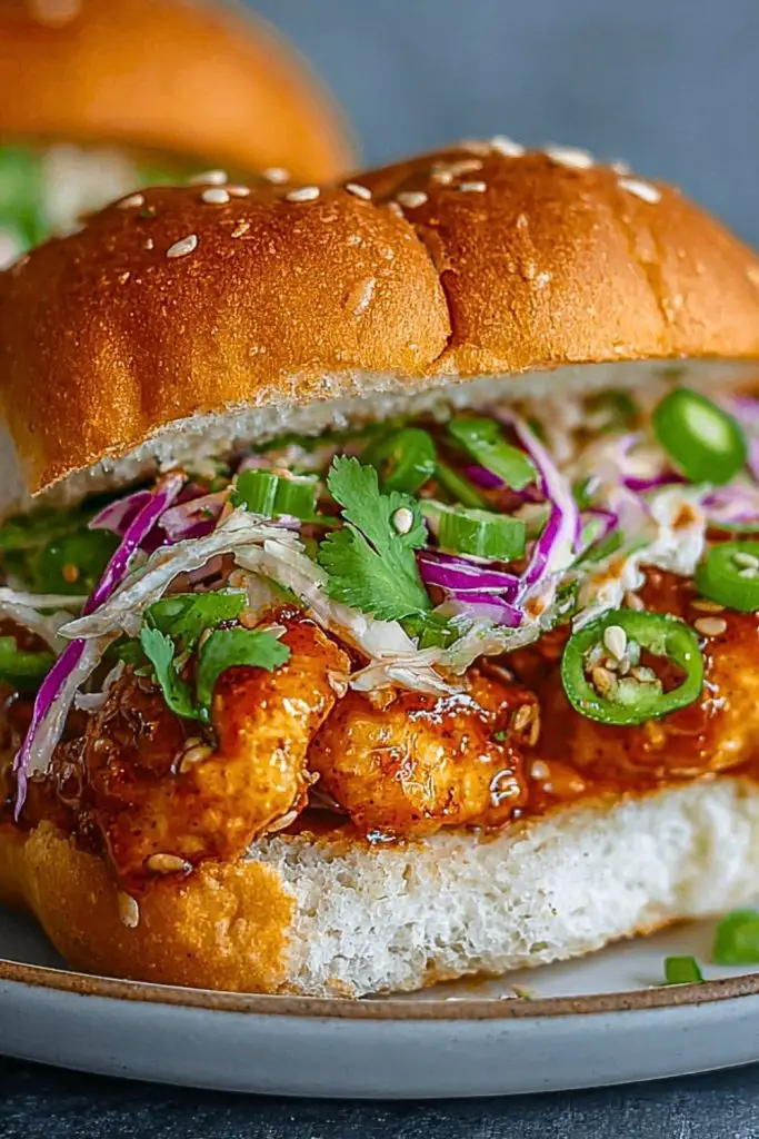Spread a generous amount of bang bang sauce on the bottom bun. Add a crispy chicken piece, a scoop of slaw, and drizzle a little extra sauce on top. Sprinkle with extra green onions and cilantro if using. Cap with the top bun and serve immediately.