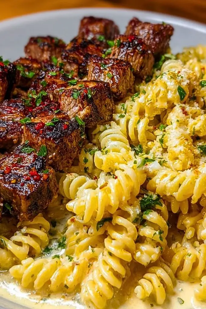 Golden-seared steak bites with a smoky crust and juicy, tender centers—paired with a creamy, rich rotini pasta that’s drenched in a velvety garlic parmesan sauce—this dish brings comfort and indulgence in every forkful. The contrast between the bold, savory flavor of the steak and the smooth, cheesy pasta creates an irresistible harmony that satisfies your cravings in one plate. A sprinkle of red pepper flakes and fresh herbs over the top adds just the right pop of heat and freshness.