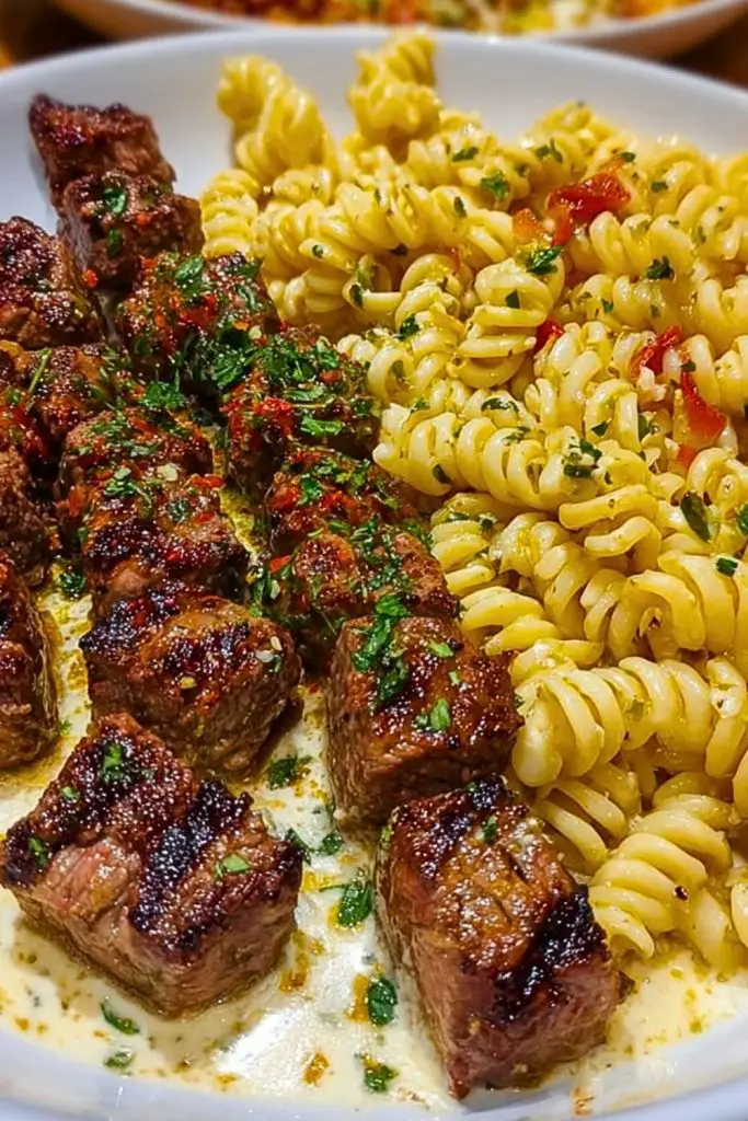 Plate the creamy rotini next to the juicy steak bites. Sprinkle everything with chopped fresh parsley and a light pinch of chili flakes for color and heat. Serve immediately for the best texture and flavor.