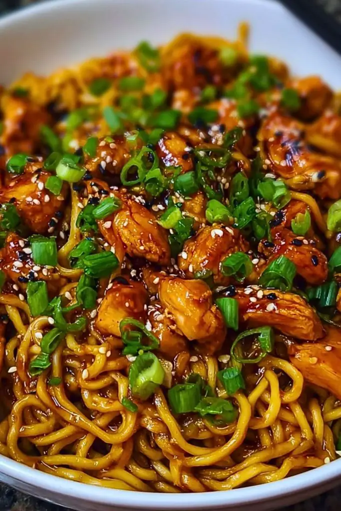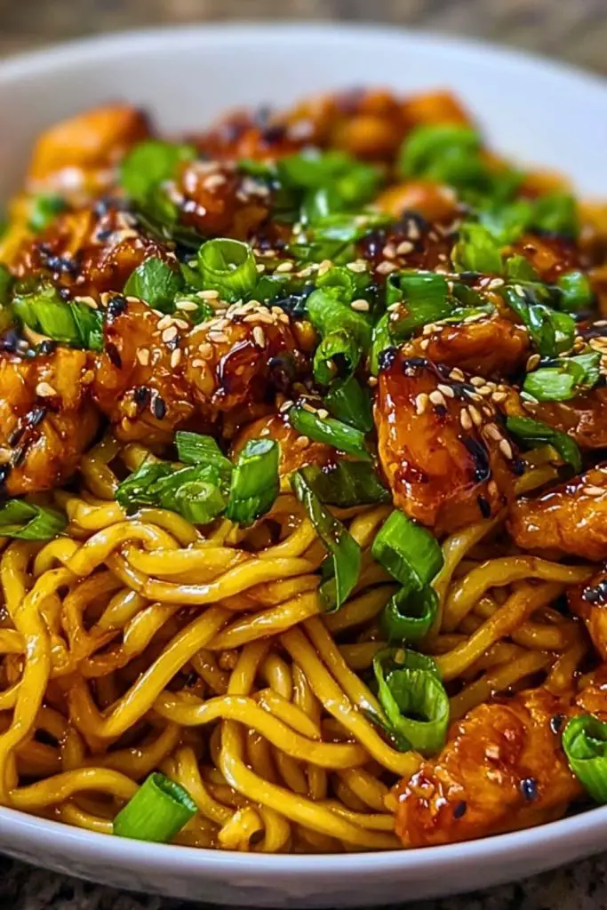 Start by cutting the chicken into uniform, bite-sized cubes so they cook evenly. Make sure your skillet or wok is hot before adding the chicken—this helps it sear beautifully, locking in the juices. Always mix your sauce in advance so you’re not scrambling once the pan is hot. Use fresh garlic for a more pungent, aromatic flavor. Don’t overcook the noodles; you want them to hold their texture and not become mushy once tossed in the sauce. Finish with freshly chopped green onions and sesame seeds for that final touch of freshness and crunch.