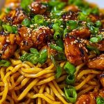 Start by cutting the chicken into uniform, bite-sized cubes so they cook evenly. Make sure your skillet or wok is hot before adding the chicken—this helps it sear beautifully, locking in the juices. Always mix your sauce in advance so you’re not scrambling once the pan is hot. Use fresh garlic for a more pungent, aromatic flavor. Don’t overcook the noodles; you want them to hold their texture and not become mushy once tossed in the sauce. Finish with freshly chopped green onions and sesame seeds for that final touch of freshness and crunch.