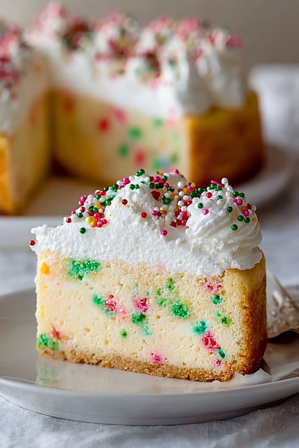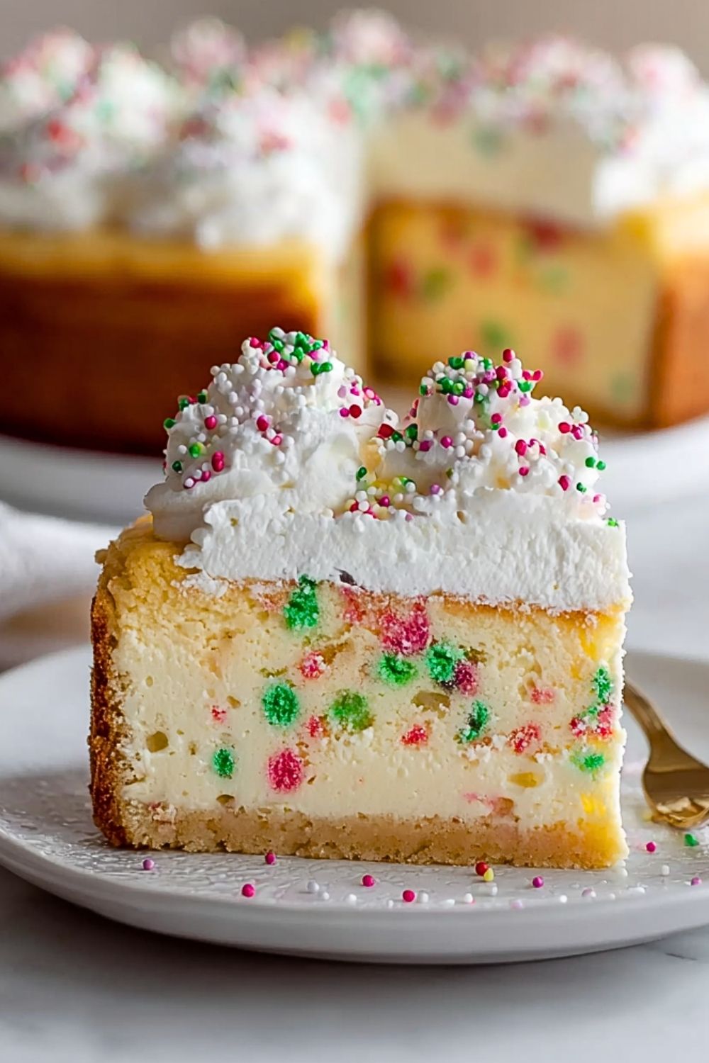 Remove the cheesecake from the oven and let it cool to room temperature. Then refrigerate for at least 6 hours, preferably overnight. Once chilled, top with whipped cream and additional sprinkles before serving. For clean slices, dip your knife in hot water and wipe between cuts.