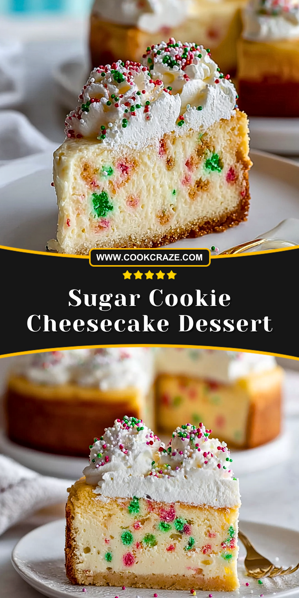 Sugar Cookie Cheesecake Dessert is the perfect fusion of two holiday classics: the nostalgic sweetness of sugar cookies and the velvety richness of cheesecake. With its festive sprinkles baked right into the creamy filling, every slice feels like a celebration. The buttery cookie crust anchors the dessert with a satisfying crunch, while the cloud of whipped topping makes it as delightful to look at as it is to eat.