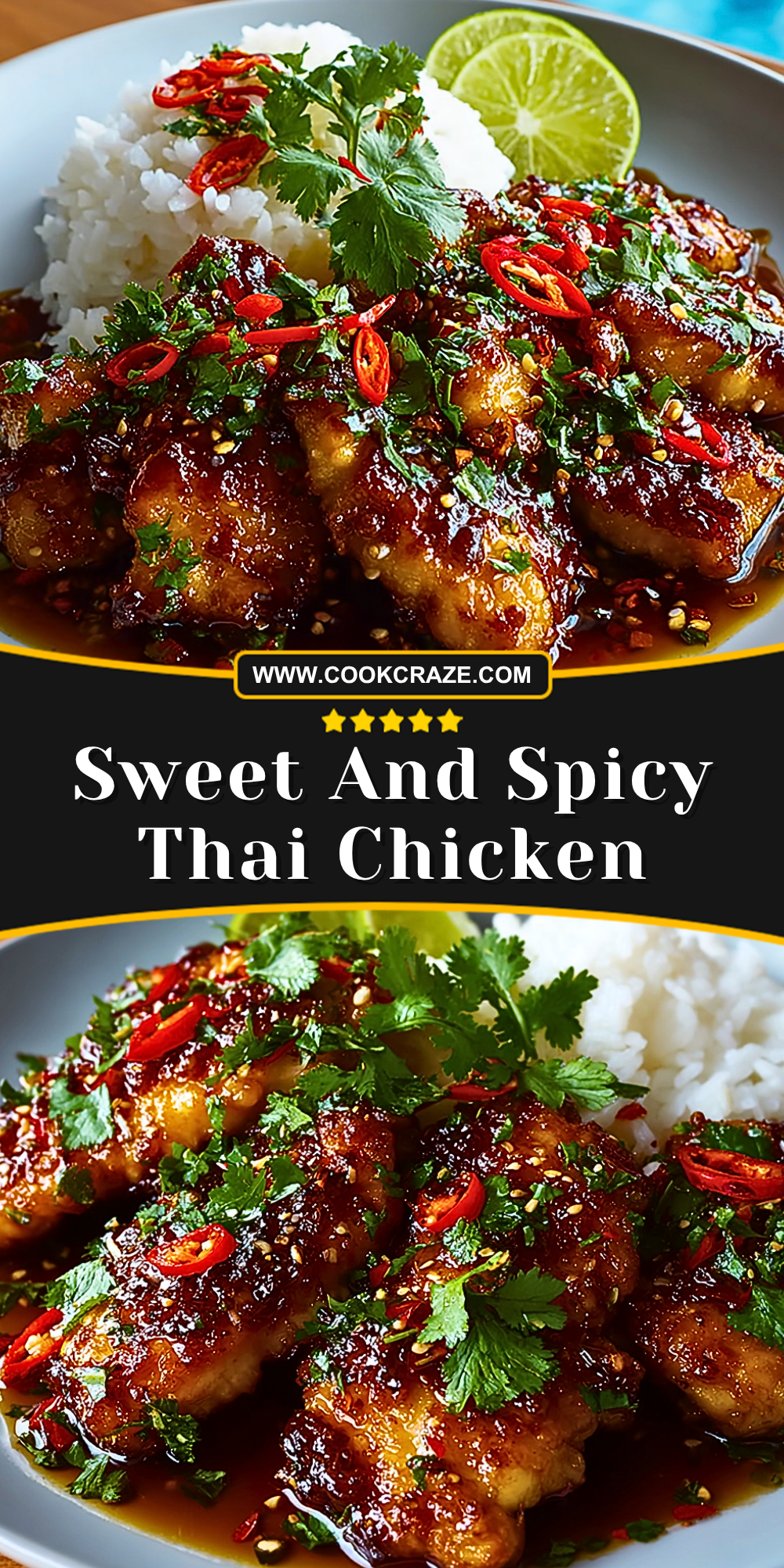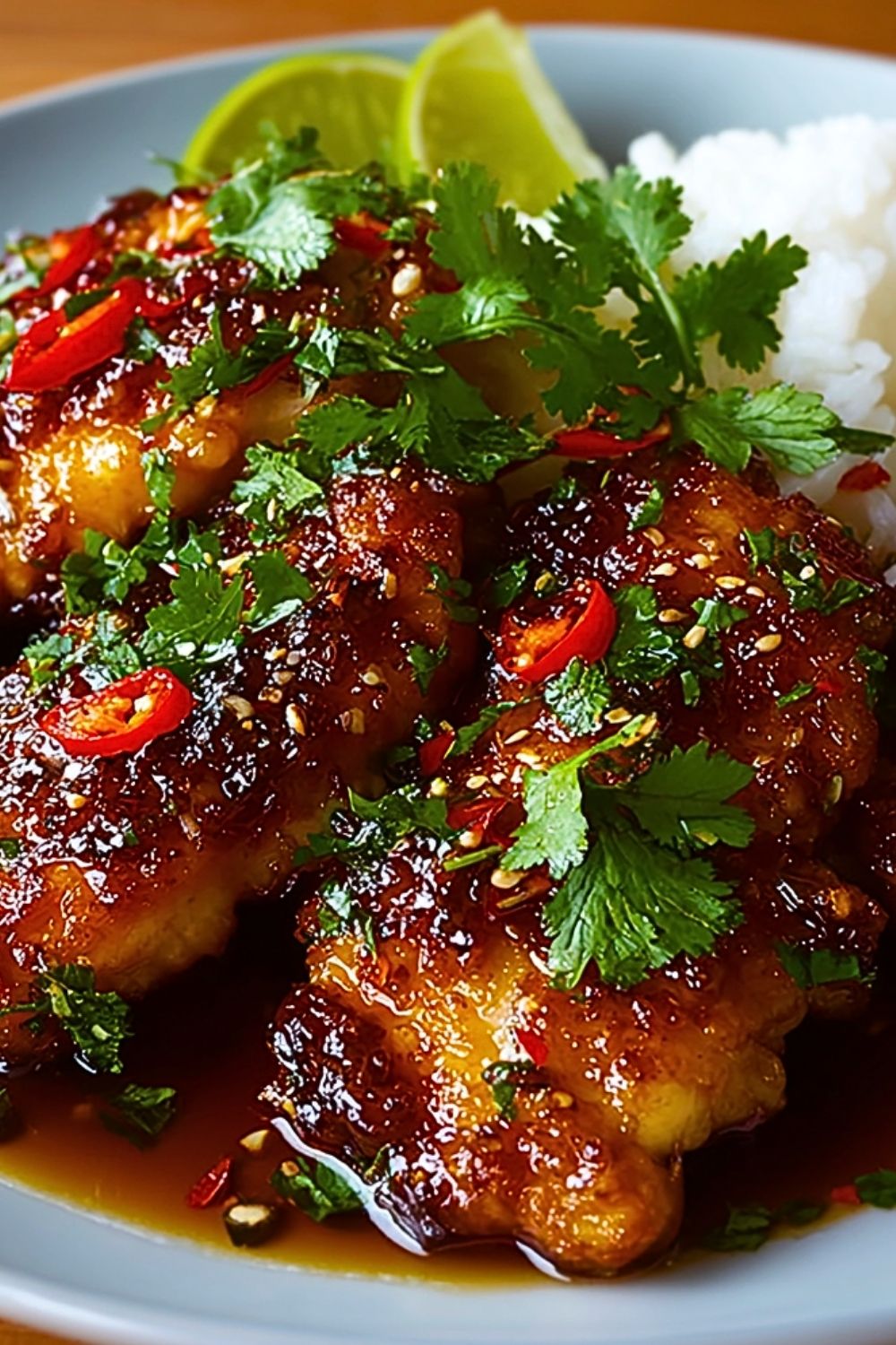 Transfer the Sweet and Spicy Thai Chicken to a serving plate. Garnish generously with chopped cilantro, extra chili slices, and sesame seeds. Serve hot alongside fluffy jasmine rice and lime wedges for squeezing over the top.