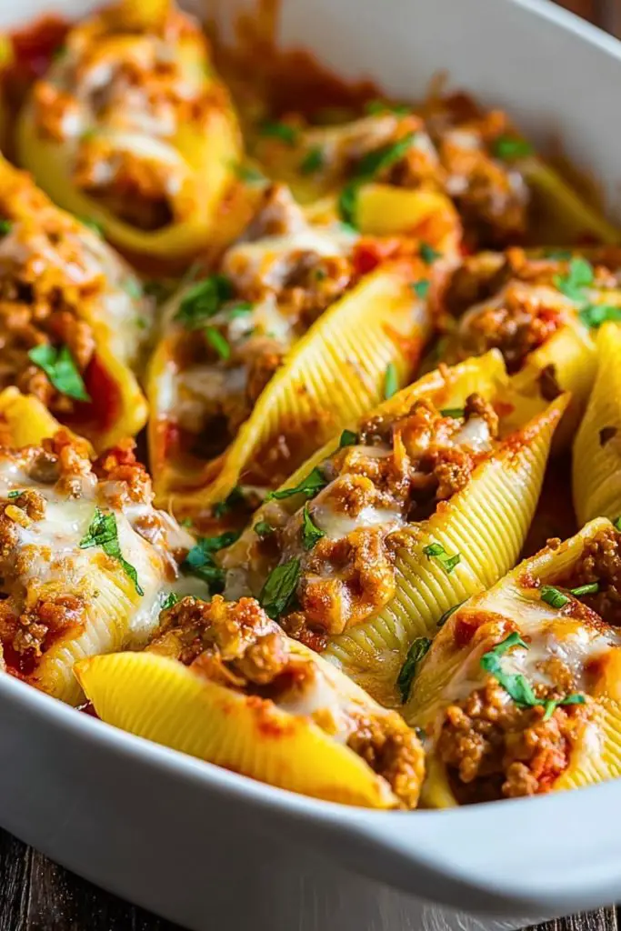 Cook your pasta shells just until al dente; overcooked shells may tear during stuffing. Let them cool slightly so they’re easier to handle. Use lean ground beef to avoid excess grease, or drain the meat well before mixing with other ingredients. To save time, prepare the meat mixture a day ahead. When stuffing the shells, don’t overfill—this helps them bake evenly and prevents bursting. Cover the dish with foil for the first part of baking to keep moisture in, then remove it to get that bubbly, golden cheese on top.