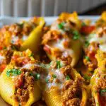 Cook your pasta shells just until al dente; overcooked shells may tear during stuffing. Let them cool slightly so they’re easier to handle. Use lean ground beef to avoid excess grease, or drain the meat well before mixing with other ingredients. To save time, prepare the meat mixture a day ahead. When stuffing the shells, don’t overfill—this helps them bake evenly and prevents bursting. Cover the dish with foil for the first part of baking to keep moisture in, then remove it to get that bubbly, golden cheese on top.