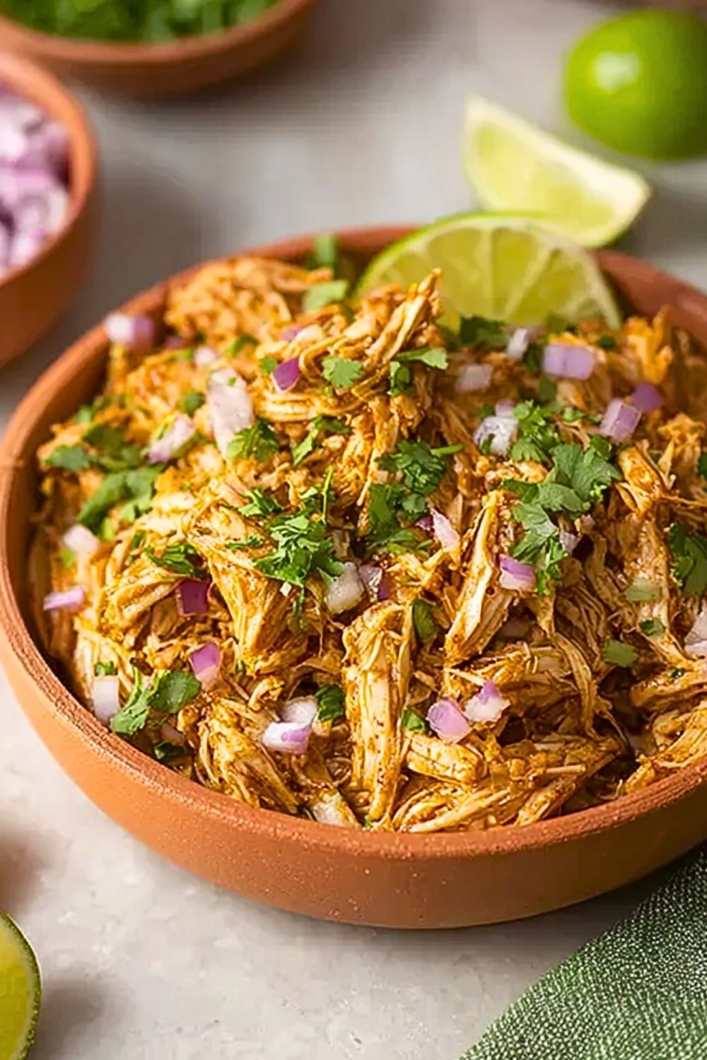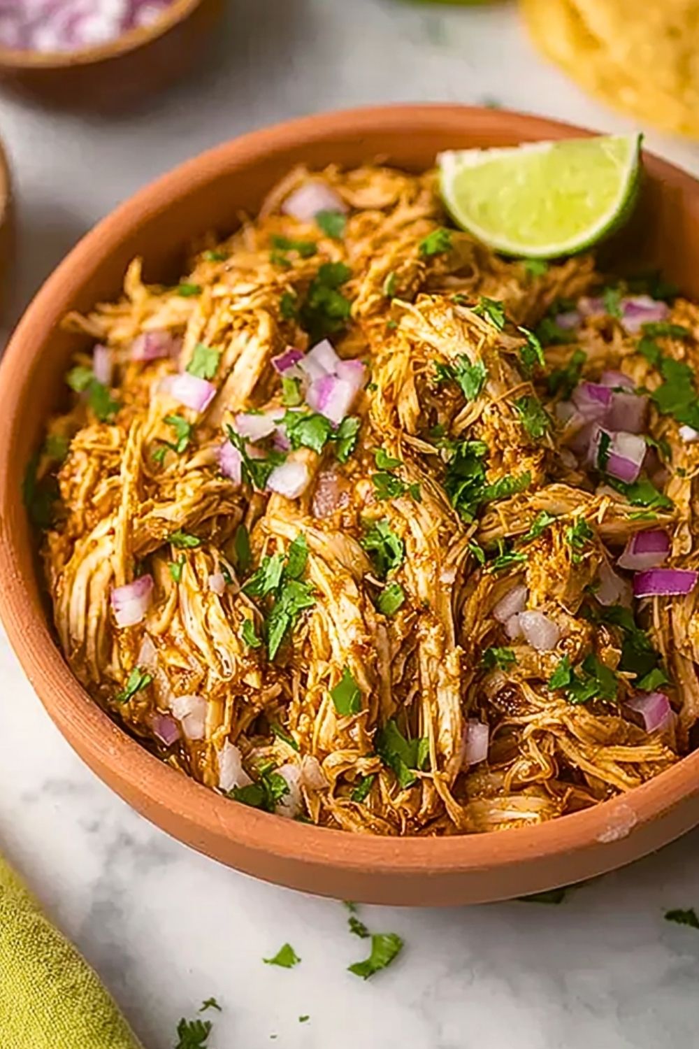 Scoop the shredded chicken into warmed tortillas and top with fresh cilantro, diced red onion, avocado, or a squeeze of lime. You can also use it in burrito bowls, salads, or over rice.
