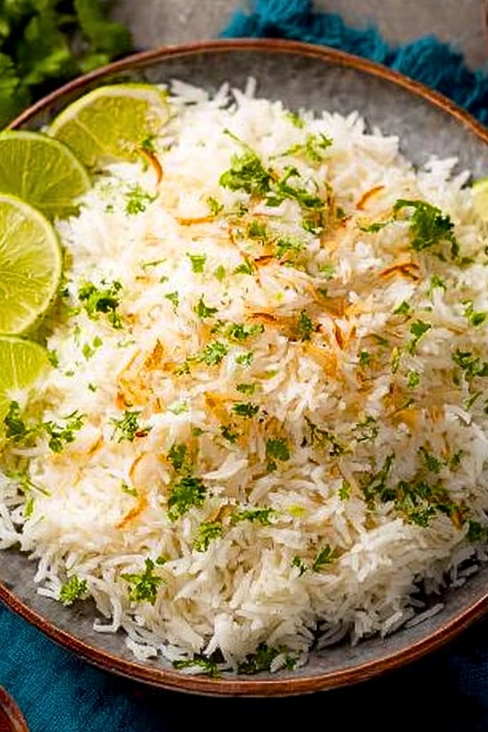 Use a fork to gently fluff the rice. Garnish with fresh chopped cilantro or parsley and lime wedges for brightness.