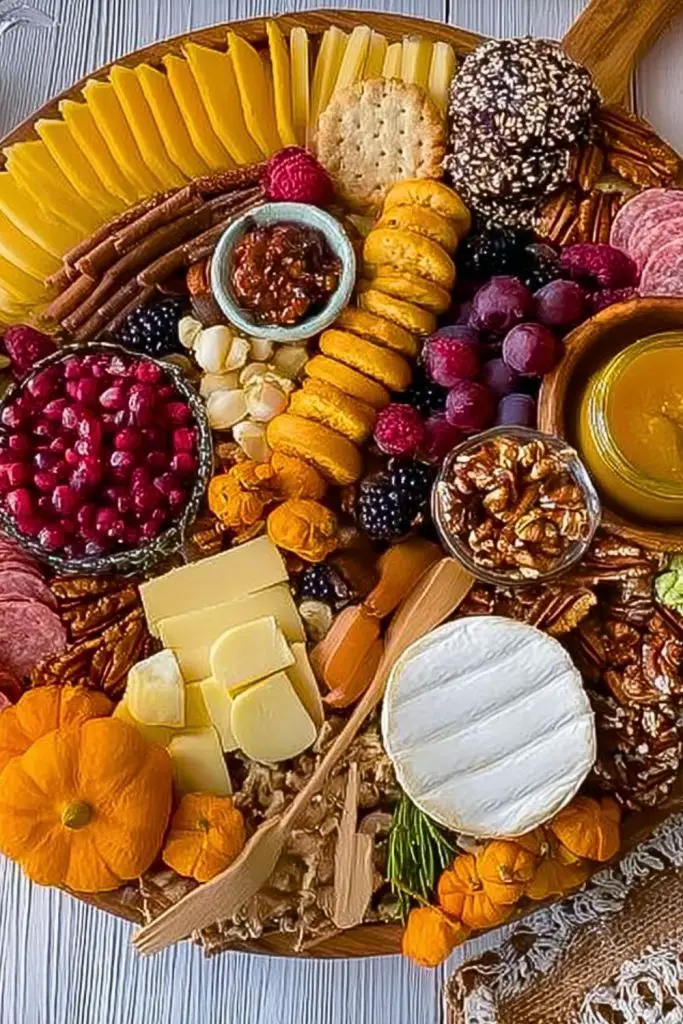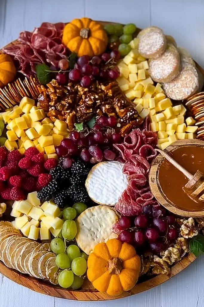 Start by placing small bowls on the board to hold dips, spreads, or small items like nuts and olives. Then, place your largest items—like cheese blocks, mini pastries, or a small pumpkin—so you create structure.