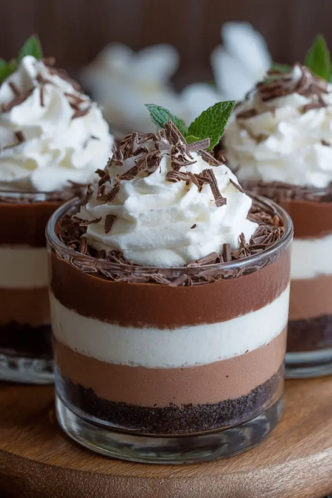 Start by organizing your ingredients and tools in advance—mise en place will help this recipe flow smoothly. Use high-quality chocolate for each mousse layer, as it significantly affects the flavor and texture. Allow each layer to set in the fridge before adding the next to keep the layers clean and distinct. When folding whipped cream into melted chocolate, make sure the chocolate is slightly cooled to prevent the cream from melting. Finally, garnish with whipped cream and chocolate shavings just before serving for that irresistible finishing touch.