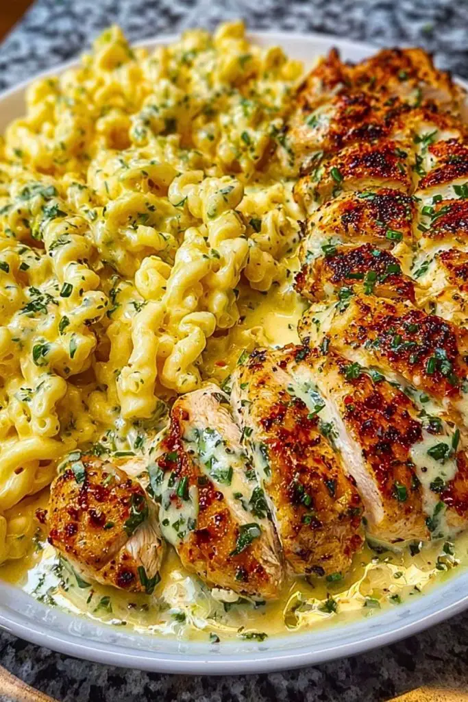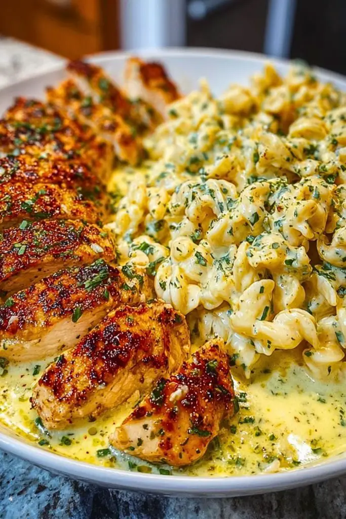 This dish hits all the right notes—creamy, savory, garlicky, and loaded with flavor. The juicy chicken breast is seasoned to perfection, pan-seared until beautifully golden, and served over pasta that’s drenched in a silky garlic-Parmesan cream sauce.
