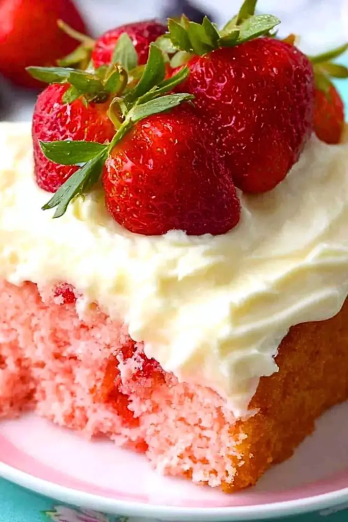 If you want to skip the cake mix, a homemade vanilla or white cake base can absolutely work—just be sure to add strawberry puree or extract to retain the flavor. You can also use dairy-free whipped topping and vegan cream cheese for a completely dairy-free version. Don’t have strawberry gelatin? Raspberry gelatin adds a fun twist without losing that fruity flair.