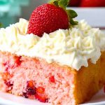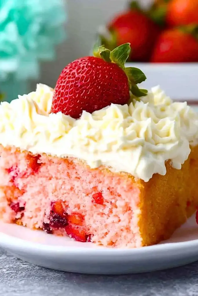 This cake is incredibly moist with a tender crumb, thanks to the strawberry gelatin and crushed strawberries blended right into the batter. The whipped cream cheese topping adds a perfectly balanced tangy-sweet finish without being heavy. It’s a cake that feels indulgent without overdoing it. Plus, it starts with a box of cake mix, which makes it foolproof—even for beginners!