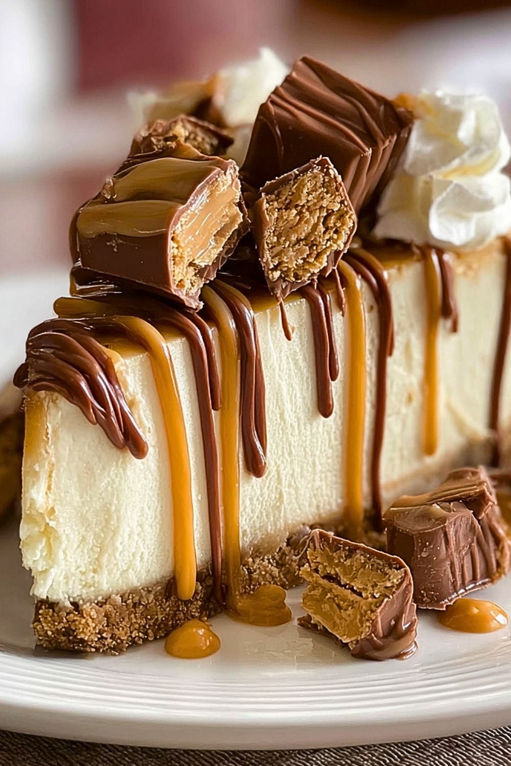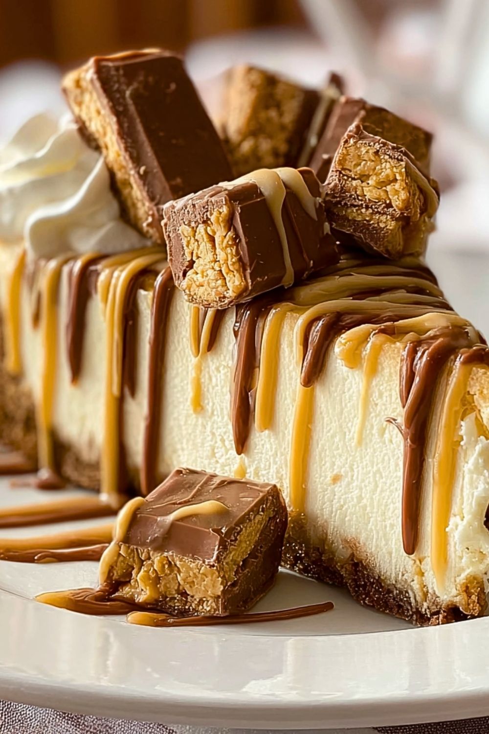 I created this recipe when I was trying to combine my two dessert loves: a classic New York-style cheesecake and anything peanut butter-chocolate related. The result is a creamy masterpiece on a graham cracker crust, topped with peanut butter cups, a drizzle of caramel and melted milk chocolate, and a cloud of whipped cream. It looks like a slice straight out of a bakery display case—but trust me, you can pull this off at home.